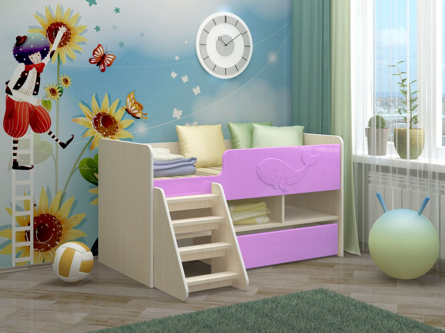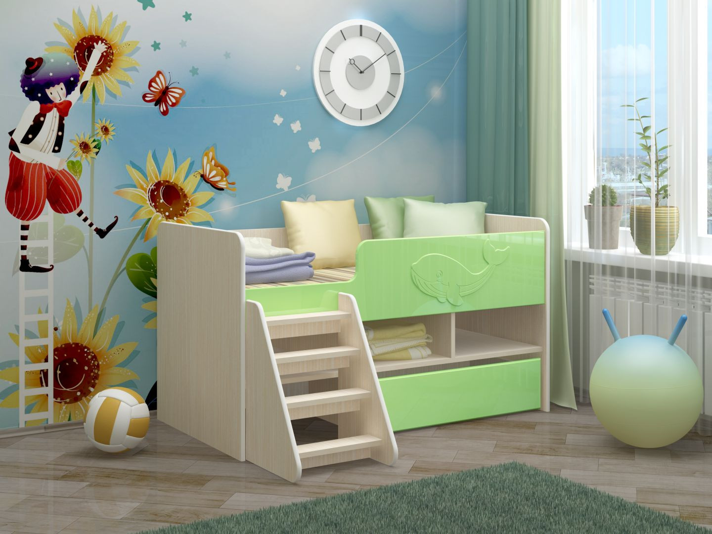 Яркие фасады изделия добавят в интерьер свежести и весеннего настроения, а веселый китенок будет чутко охранять сон Вашего ребенка. Нижний ящик оснащен колесиками, что позволит его выдвигать полностью и в случае необходимости убирать или передвигать. Для безопасности Вашего ребенка, щиты обтянуты кантом, а на удобных полочках разместятся все игрушки и вещи Ваших деток.