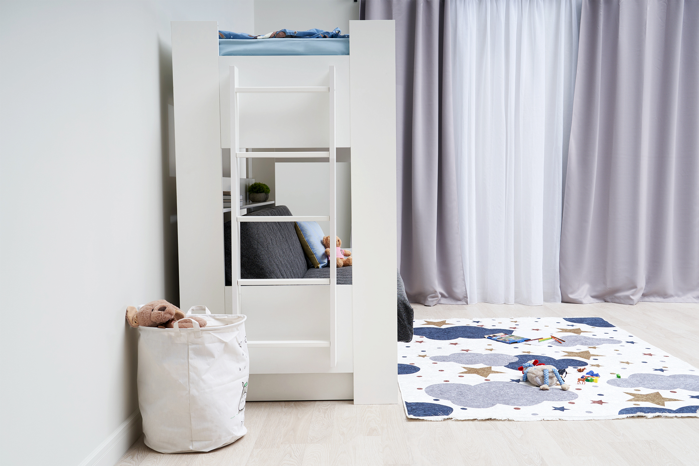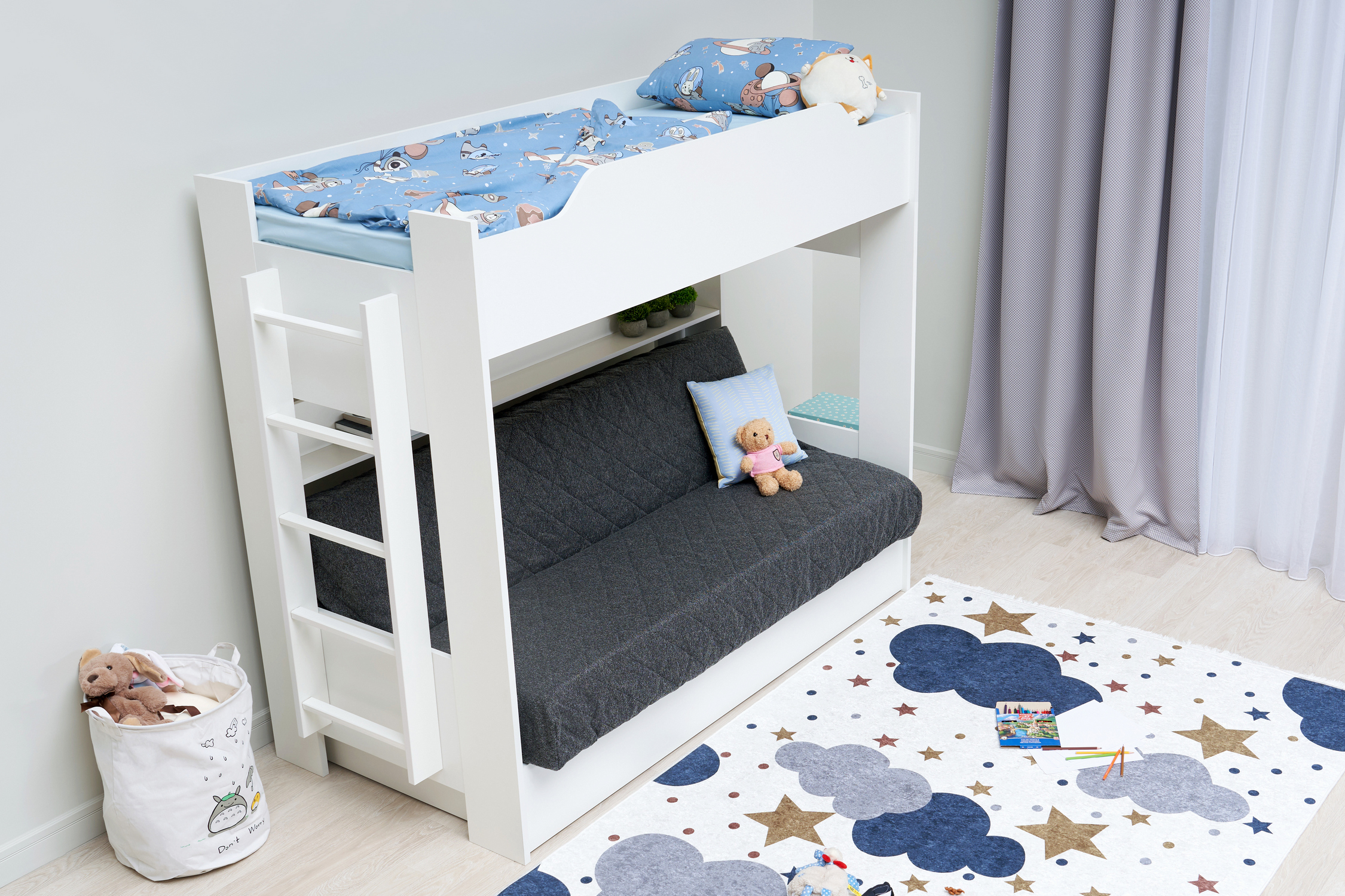 Механизм трансформации дивана: «Книжка». Рекомендуемая высота матраса на верхний ярус 17 см. Максимальная нагрузка на верхний ярус 50 кг. Лестница может быть установлена с обеих сторон кровати. Высота бортика 30 см. Максимальная нагрузка на нижний ярус 90 кг. Чехол съемный. |