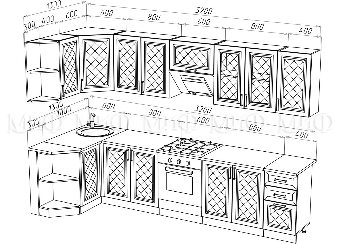 • Глубина шкафов: Верхние 300 мм/Нижние 600 мм/Глубина столешницы 600 мм